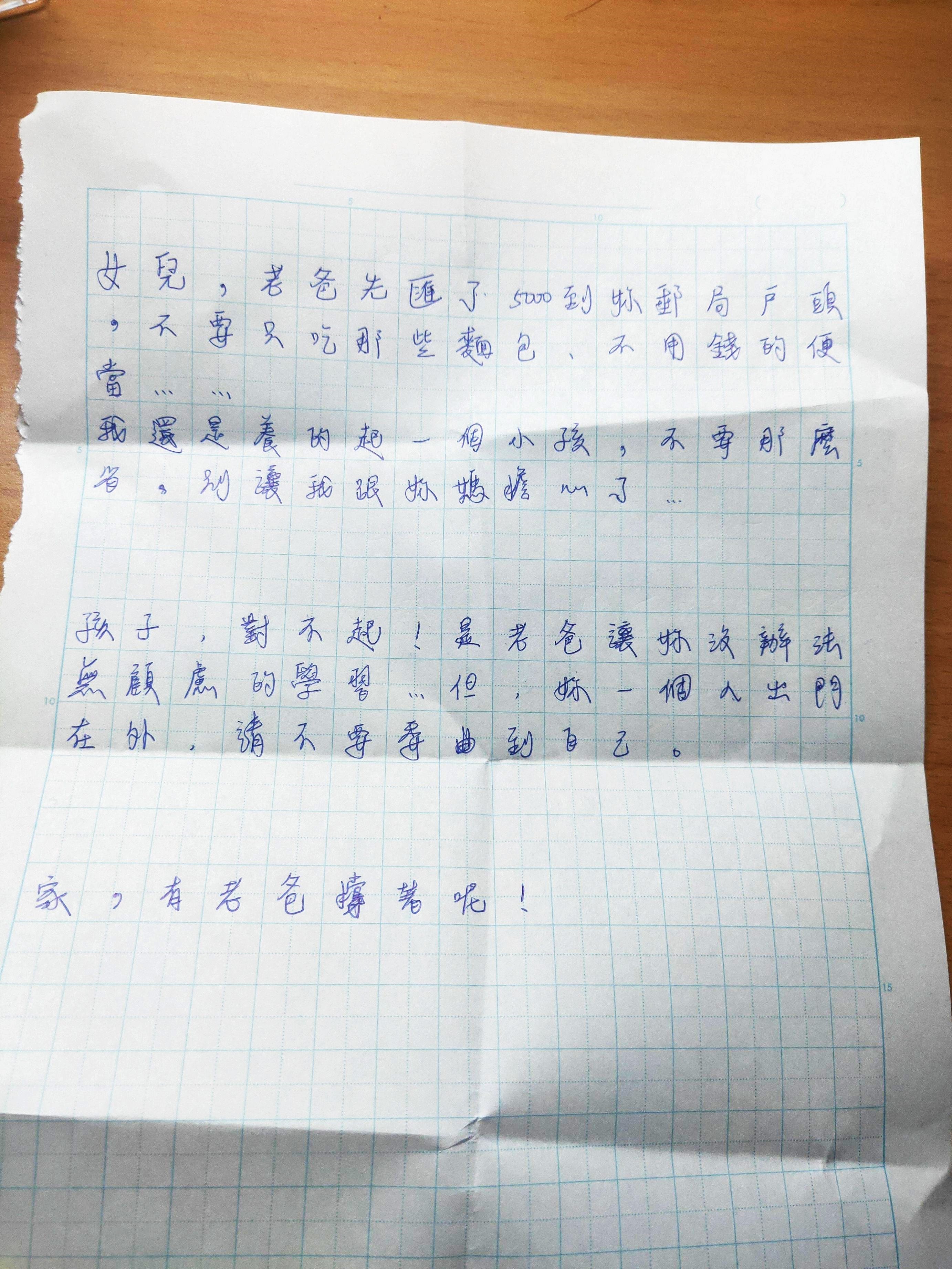▼原po回自己房間時,發現書桌上有一封信。那是爸爸親手寫給她的,信上說:「女兒,老爸先匯了5000到妳郵局戶頭,不要只吃那些麵包、不用錢的便當……我還是養得起一個小孩,不要那麼省,別讓我跟妳媽擔心了。孩子,對不起,是老爸讓你沒辦法無顧慮地學習…但妳一個人出門在外,請不要委屈到自己。家,有老爸撐著呢!」
