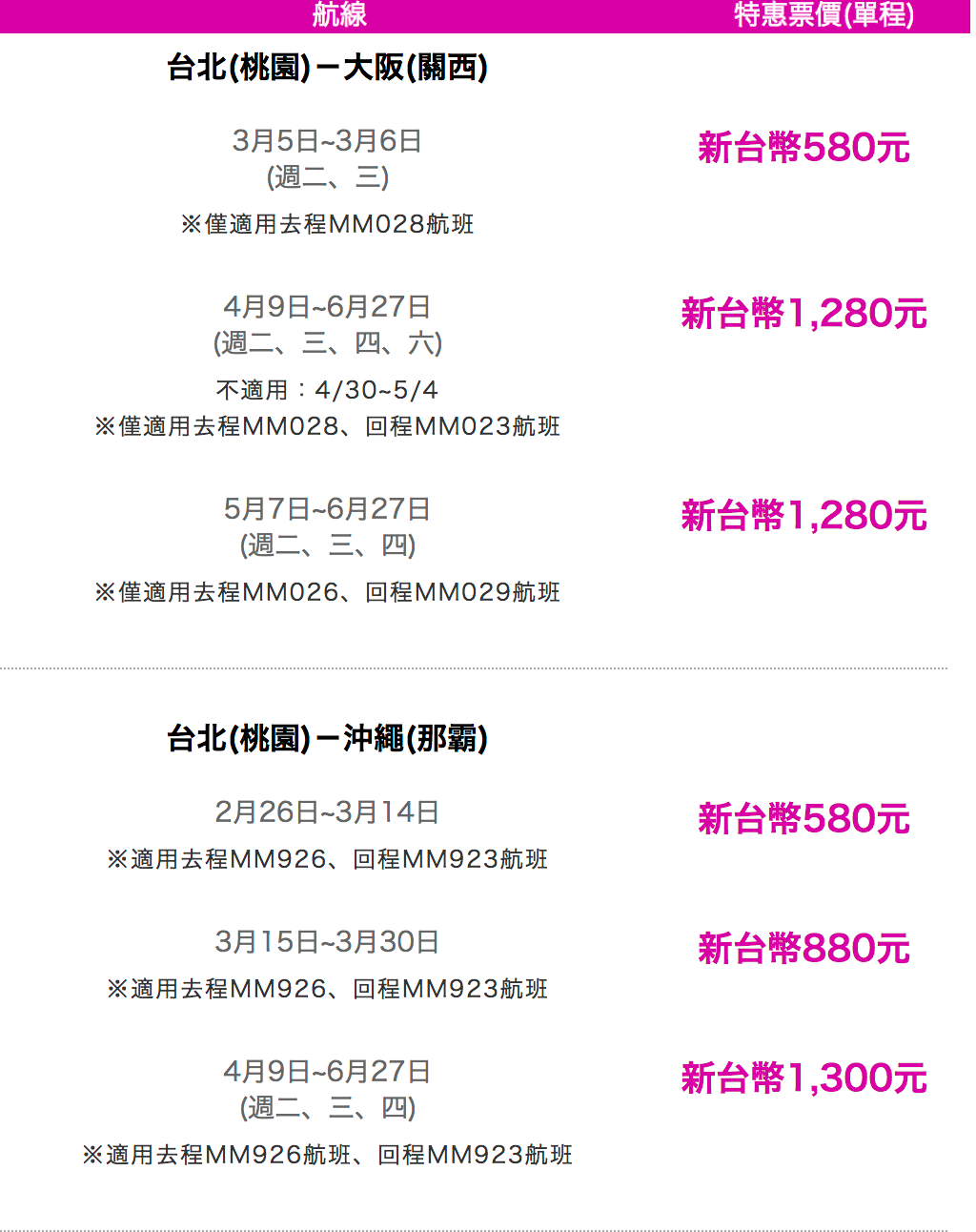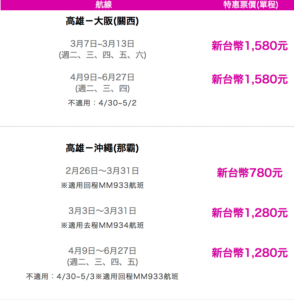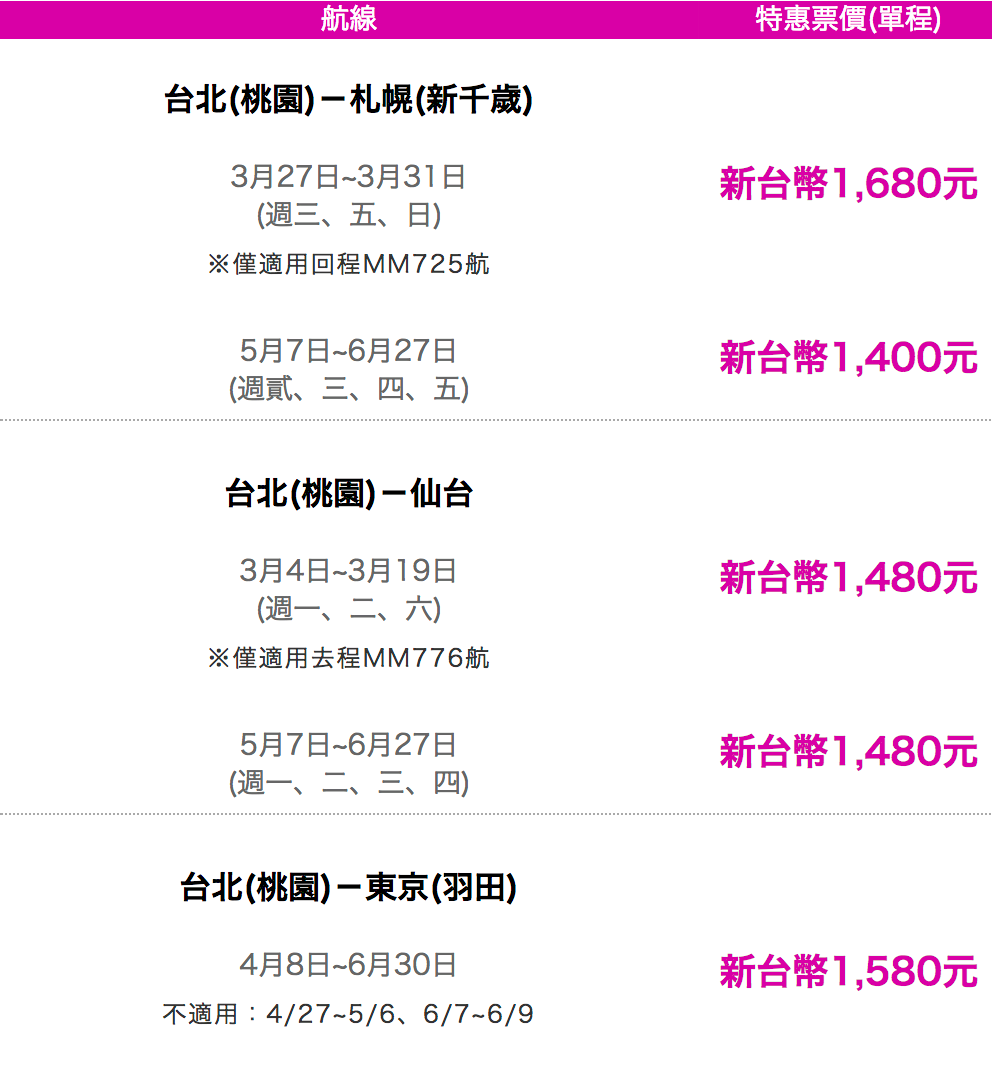 ※適用出發日期、票價依各航線有所不同,敬請留意。
