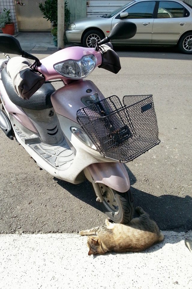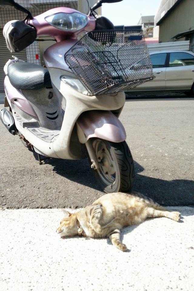 ▼根據網友表示,這隻胖嘟嘟的可愛貓咪是她們的家中愛貓「嘎B」,當時她正準備要騎車出門卻發現牠躺在機車前撒嬌打滾。嘎B,其實是林絹琄領養而來的浪貓。大約4年前,有一位開畫室的老師從台北下台南,尋找適合的場地開設南區教室,該名老師恰巧發現在附近的流浪小貓,小貓由附近的店家輪流餵養,卻遲遲沒有人收編,擔心小貓會在馬路邊亂跑,老師只好發文協助認養,那隻小貓就這樣輾轉成為林絹琄的家人。