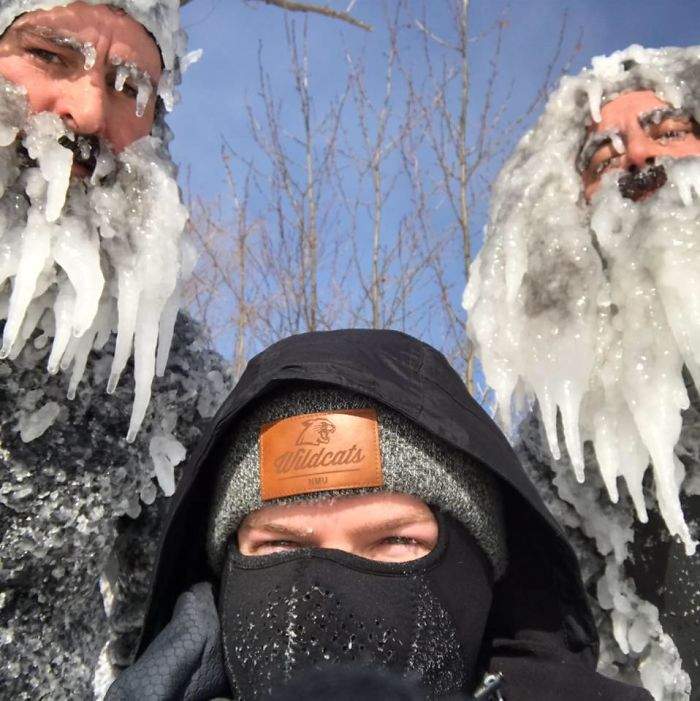 ▼冰天雪地中的他們熱情不減,怪異的髮型和鬍子也讓網友忍不住評論:「這是在拍攝《水行俠:零下》?」