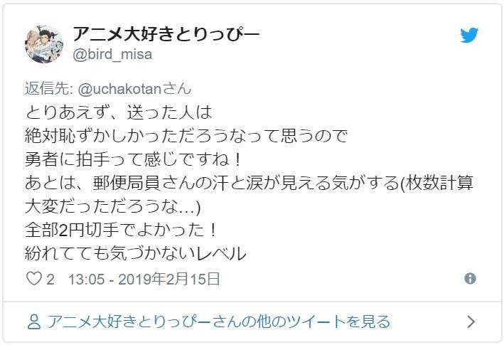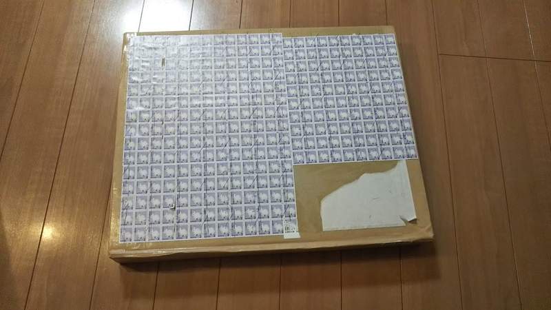 ▼原PO傻眼:「這個滿滿都是2日圓郵票的包裹到手了,正面和背面都貼得滿滿的,裡面還出現老大呢!」