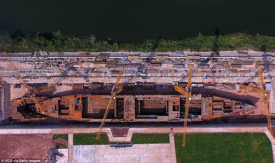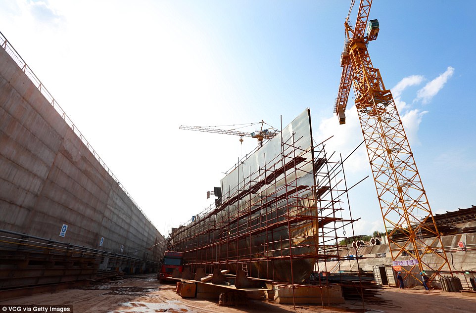 ▼2017年時,仿製版鐵達尼號已經完成一半,如今船體已經初步成型,現場有很多建築設備。