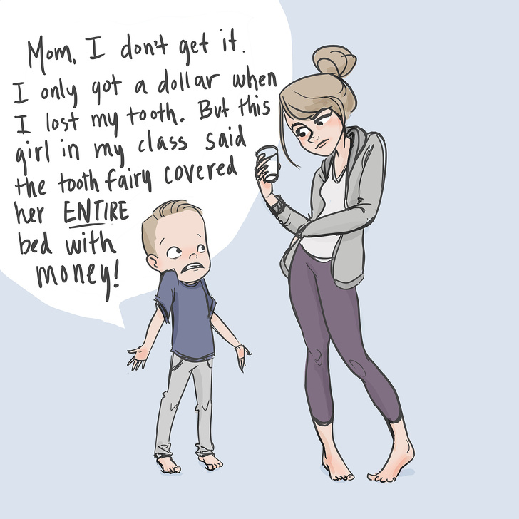 ▼8.「媽~我不明白。我掉牙的時候只有1塊錢,同班的女同學卻說牙仙子把錢都鋪滿她的床!」