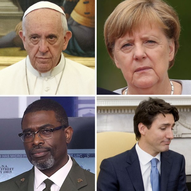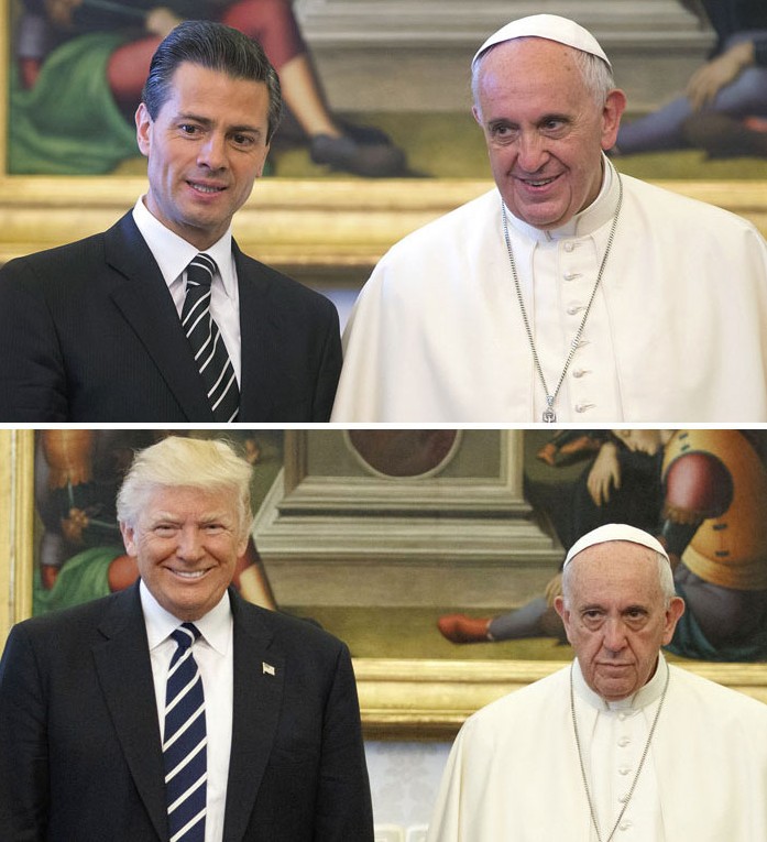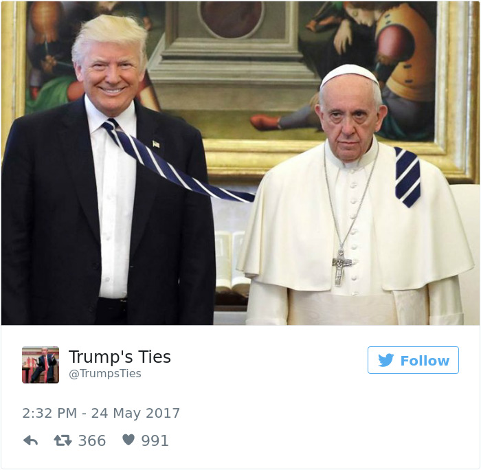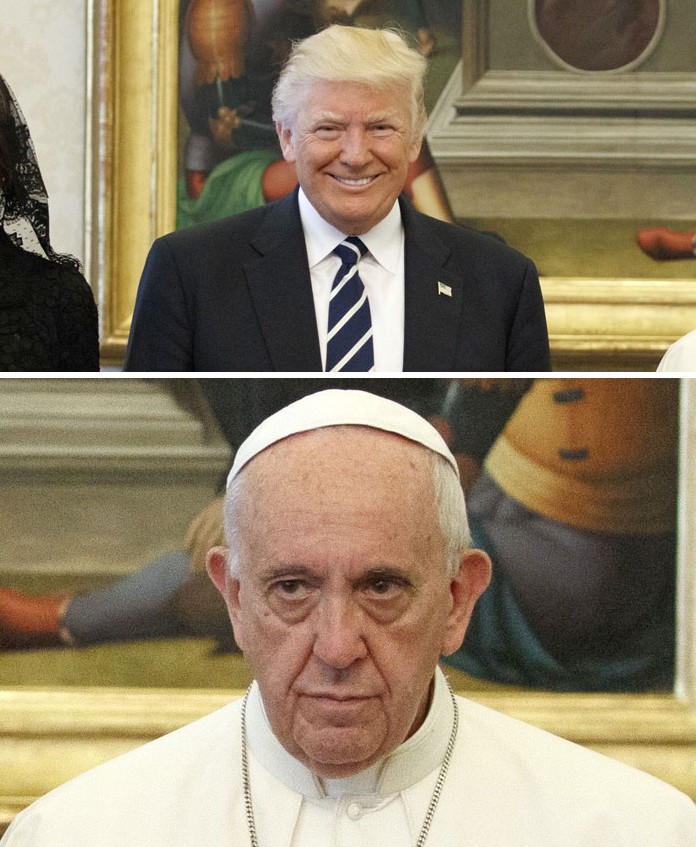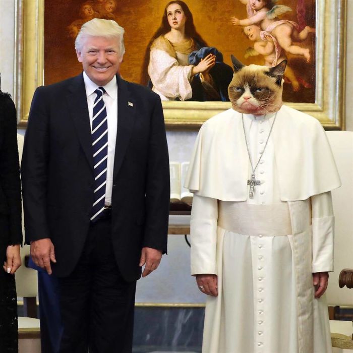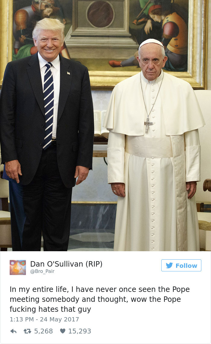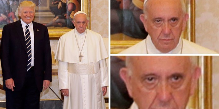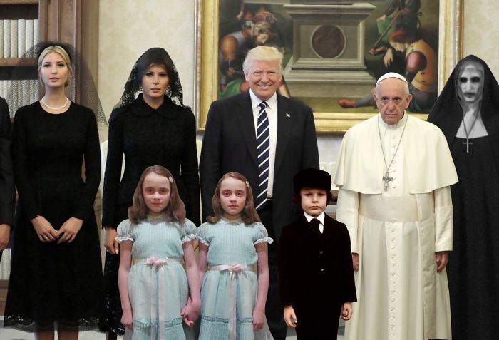 2019年02月20日美國總統川普曾經2017年前往拜訪教宗,不過兩人在會面時一張照片卻引起了熱烈的討論,兩人在會面時原本相談甚歡,不過在大合照時,教宗的表情卻說明了一切。網友在看到這張照片之後,直接開啟了一波「PS大賽」和各種神詮釋,一起來欣賞網友們的創意吧!
