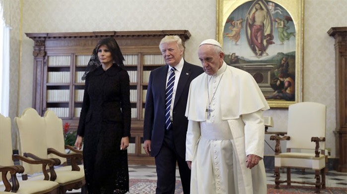 ▼這張圖仿佛教宗在帶領川普夫婦參觀房間:「這裡有椅子、地板、牆壁… 沒了,你可以走了!」