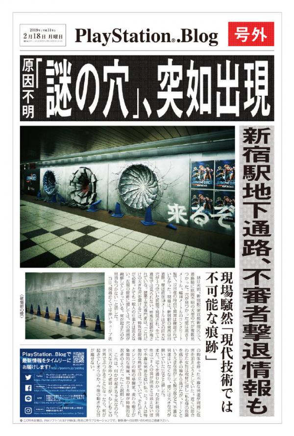 ▼為此宣傳,官方可是創意十足,在推特上不斷流傳著一張號外傳單,寫著「東京地鐵新宿站,居然出現了3個謎之洞穴」、「現代技術覺不可能造成的驚人戰鬥痕跡」。