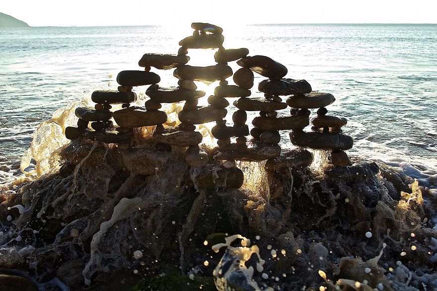 ▼在海灘、溪流撿來大大小小的石頭,將它們排成石堆是詹姆斯常用的創作法。