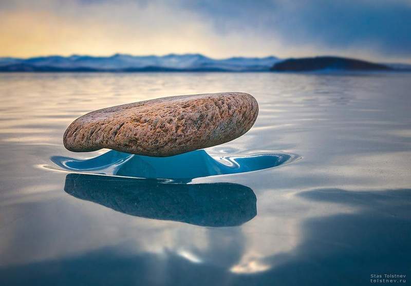 看到這照片,第一個反應可能是「這是合成的吧?」、「打水漂的瞬間照片?」,其實都不是,這是在俄羅斯湖貝加爾湖的奇特異象,被稱為「Baikal Dzen」也就是「瞬間凍結的石頭」,特別的氣候加上陽光照射,形成了這獨特的自然奇景。
