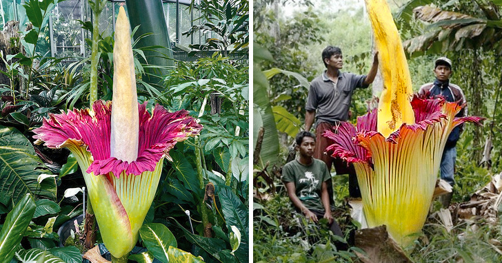 ▼1.巨花魔芋(屍花、泰坦魔芋):它開花的時候會散發出一股類似屍臭的味道。花序可以高達三公尺以上。原生地為印尼的蘇門答臘熱帶雨林。