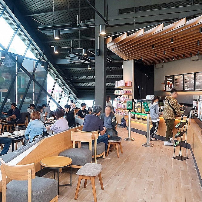 ▼在建築上因屋頂設計的關係,內部裝潢也採用挑高設計,桌椅之間距離適當,整體看來空間相當寬敞,不僅外表與常見星巴克不同之外,內裝也是別有一番心思。