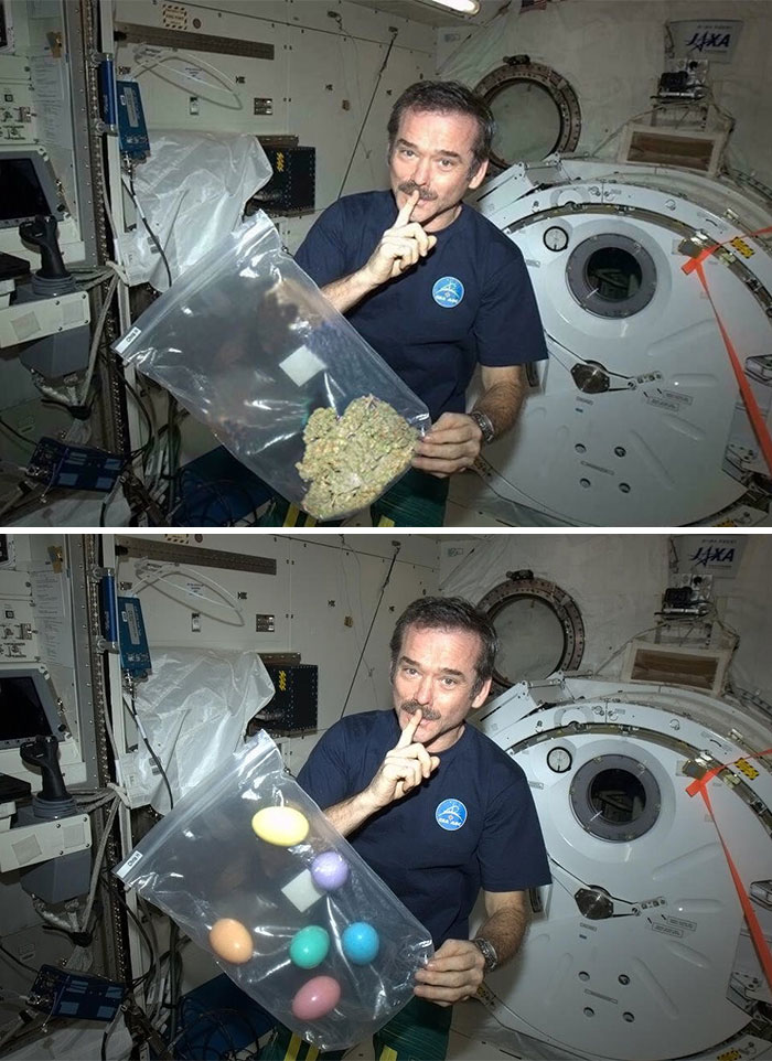 真相:加拿大太空人Chris Hadfield經常在太空梭中拍攝影片,向人們展示真實的太空生活。他準備了一些復活節彩蛋,想給同事們驚喜。