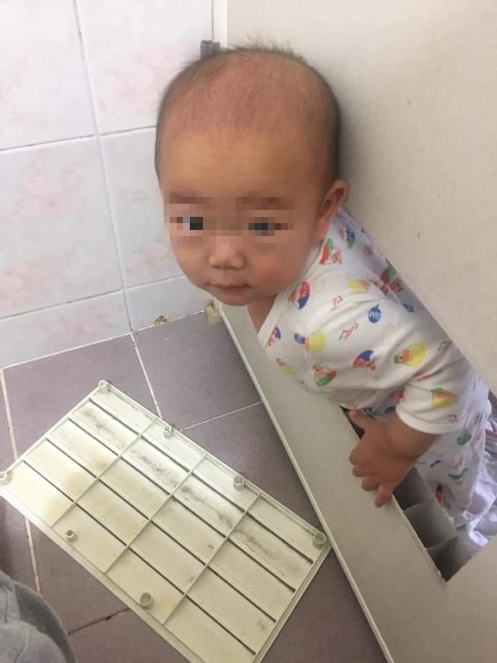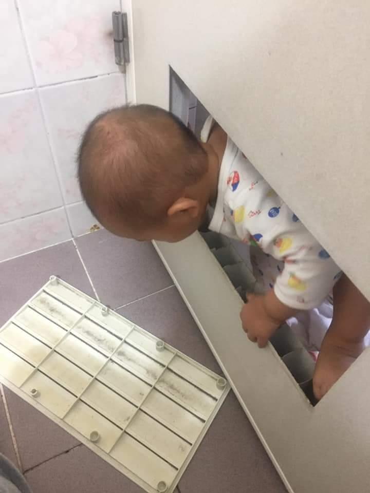 ▼媽媽拍照留證,正努力往裡爬的寶寶還抬起頭直視鏡頭,好像在說:「我終於找到你啦。」他可愛的模樣讓人心都融化,但媽媽卻很崩潰,她連上廁所的自由都被剝奪了。