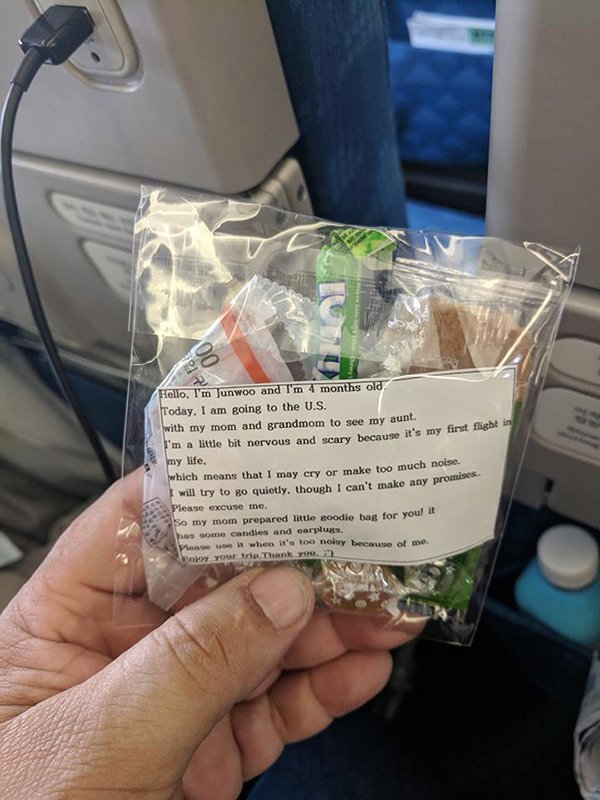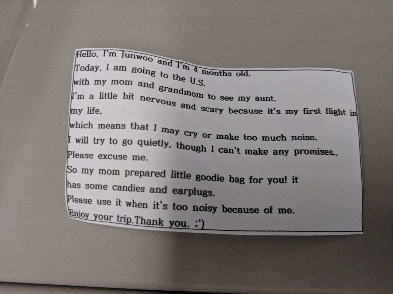 ▼紙條上以寶寶為第一人稱,上面寫著:「哈嘍,我是 Junwoo,我已經4個月大了。今天我要跟媽媽和阿嬤一起去美國探望我阿姨,我有點緊張和害怕,因為這是我人生第一次搭飛機。代表我可能會吵鬧、發出噪音,我也會試著安靜下來,可是我無法做出保證,請原諒我。所以我媽媽準備了這份小禮物給你!裡面有一些糖果和耳塞,如果覺得我太吵時,請使用這些東西,並享受你的旅程,謝謝!」