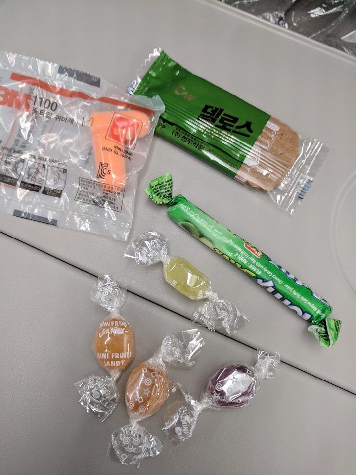▼從圖片中可以看到,這份貼心的小禮物是幾顆糖果、一副耳塞和一張紙條。