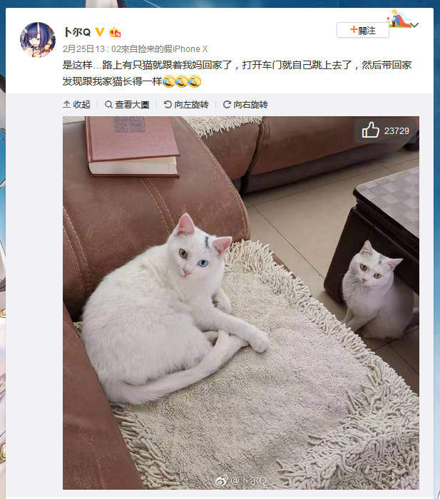 ▼網友「卜爾Q」在微博上發了一篇文章,上面寫道:「是這樣…路上有隻貓就跟著我媽回家了,打開車門就自己跳上去了,然後帶回家發現跟我家貓長得一樣!」
