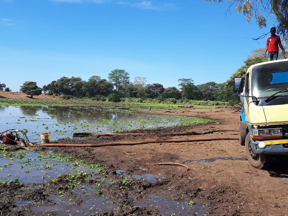 ▼Patrick租來一輛水車,每天開好幾小時找乾淨的水源,然後把水運回國家公園。這輛車一次可以載3000加侖水,足夠動物們保命。
