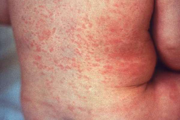 ▼一開始可以透過發燒、出疹、鼻炎、結膜炎、咳嗽等發現症狀,口腔也會在發燒約4天後出現斑點,然後4天內會看到全身也有,嚴重者甚至會併發中耳炎、肺炎或腦炎。