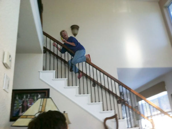 ▼70歲的她拿著一根香蕉,從樓梯扶手上滑了下來。