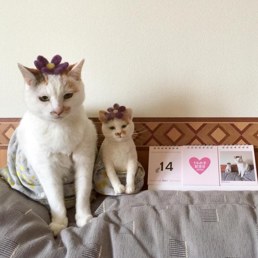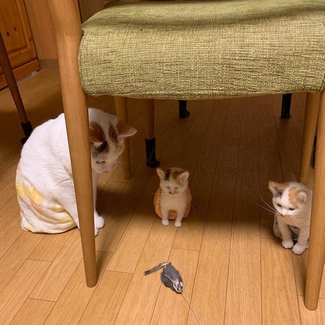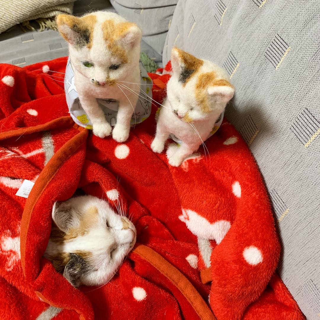 ▼其實那兩隻小貓咪是用羊毛氈做的。主人很愛Maru,又有一雙巧手,就以牠為範本,做了一隻和牠一模一樣的羊毛氈玩偶。
