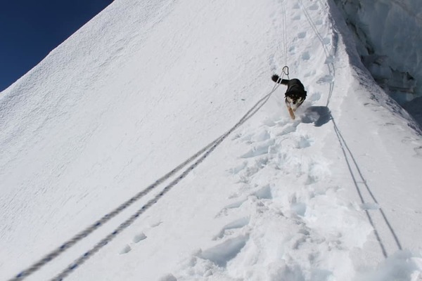 ▼登山的過程並不輕鬆,隊員們要克服很多困難,高原反應、陡峭山坡、一個個冰川,這些都是巨大的挑戰。他們能夠借助的只有一條簡單的繩索。一次地勢太險峻,需要繩索下降,隊員們沒辦法兼顧Mera,就將牠綁在營地。但Mera不願意與大家分開,牠偷偷咬斷了繩索,趕上了隊伍。
