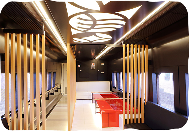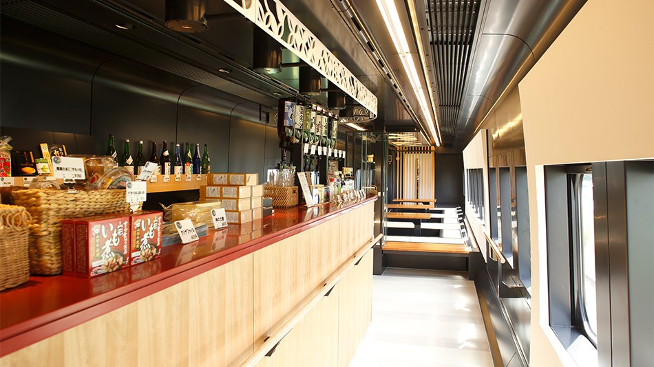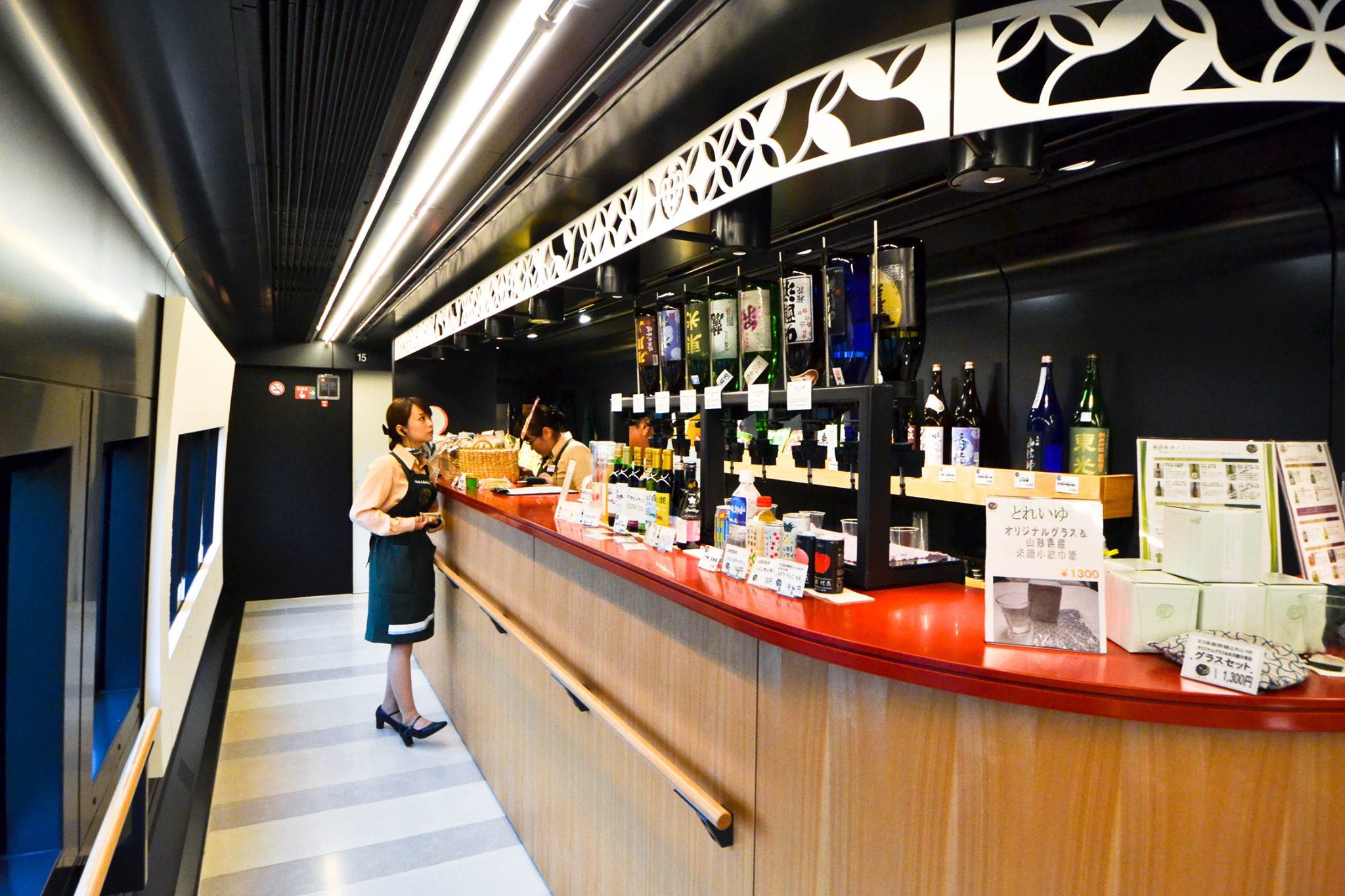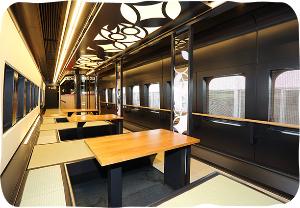 ▼隔壁15號車廂是泡完足湯後的休息室,內有吧檯販賣食物、飲料、土產等商品,還有榻榻米宴席座位。