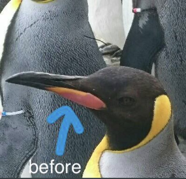 ▼是的!沒有錯,在每年冬季要與春季交替的期間,是國王企鵝換毛的時期,在羽毛替換的期間,嘴喙的橘色部分,也會一起掉落換新。