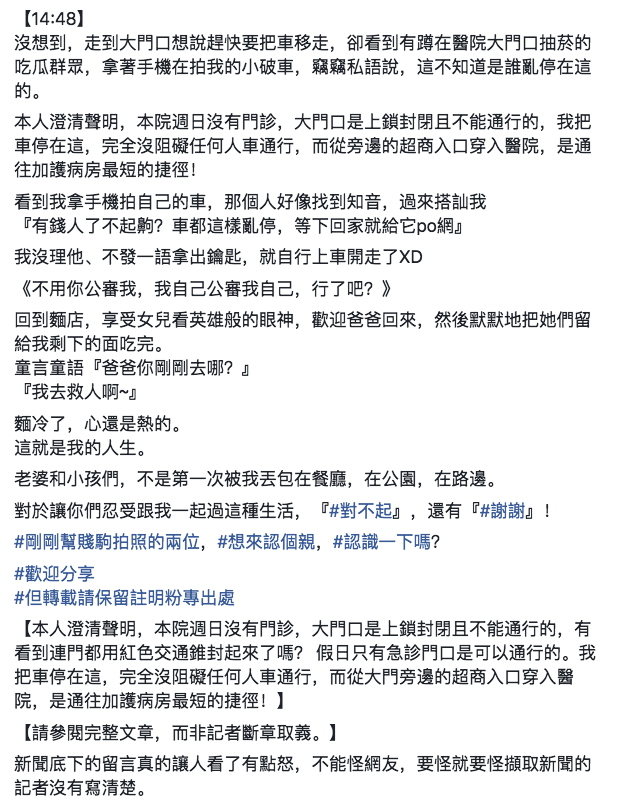 ▼原po之後將自己的行為先po到網上,也解釋雖然醫院有配車位給他,可是從車位走到加護必須花10分鐘,如果停在大門就可以從一旁的超商入口直接進入,是通往加護房的最快路徑。加上當天是週日,醫院沒有門診,大門是鎖上的無法通行,因此沒有阻礙人車的疑慮。最後他也向那兩個「吃瓜民眾」喊話:「不用你公審我,我自己公審我自己,行了吧?」