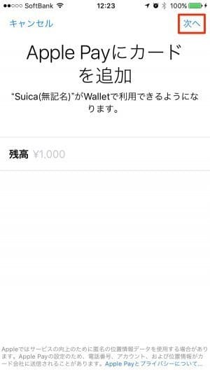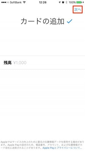 ▼9.付款完成後點選「次へ(下一步)」,將西瓜卡加入Apple Pay錢包中。