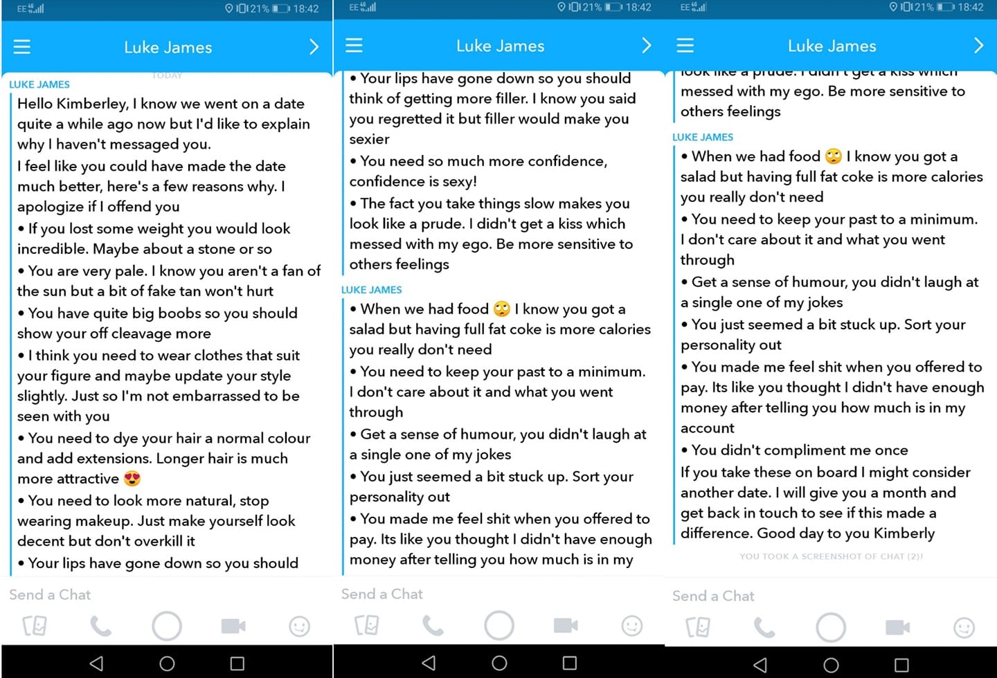 2019年03月13日許多現代人都會在交友App 上認識新朋友,不過這名英國女子 Kimberley 就遇到了一位超奇葩的約會對象,他們在初次約會之後就沒有再聯絡,結果3個月後竟然收到男方傳來的「改進清單」,列出了15個事項要求,如果女生可以做到他會考慮再給「一次機會」。氣炸的 Kimberley 將男方傳來的訊息公布到網路上,網友看完之後也直呼:「這人根本是瘋子!」