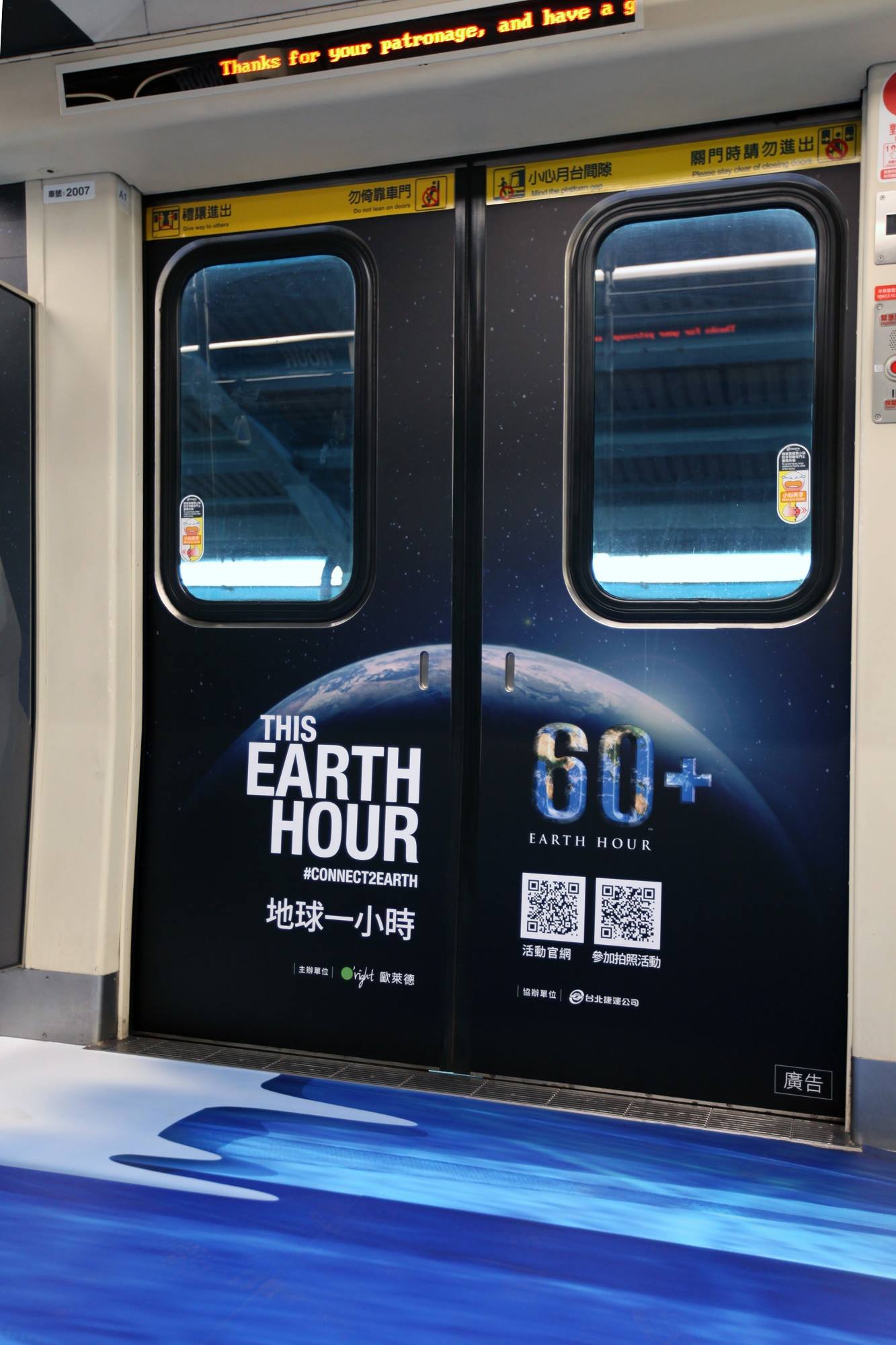 2019年03月13日全球暖化,冰山溶化,許多動物的生存環境開始受到危害、消失,2019「Earth Hour地球一小時活動」將於30日登場,企業與北捷合作,將溶解的冰川搬到捷運車廂裡,透過3D彩繪的方式,讓乘客可以體會地球暖化的危機。