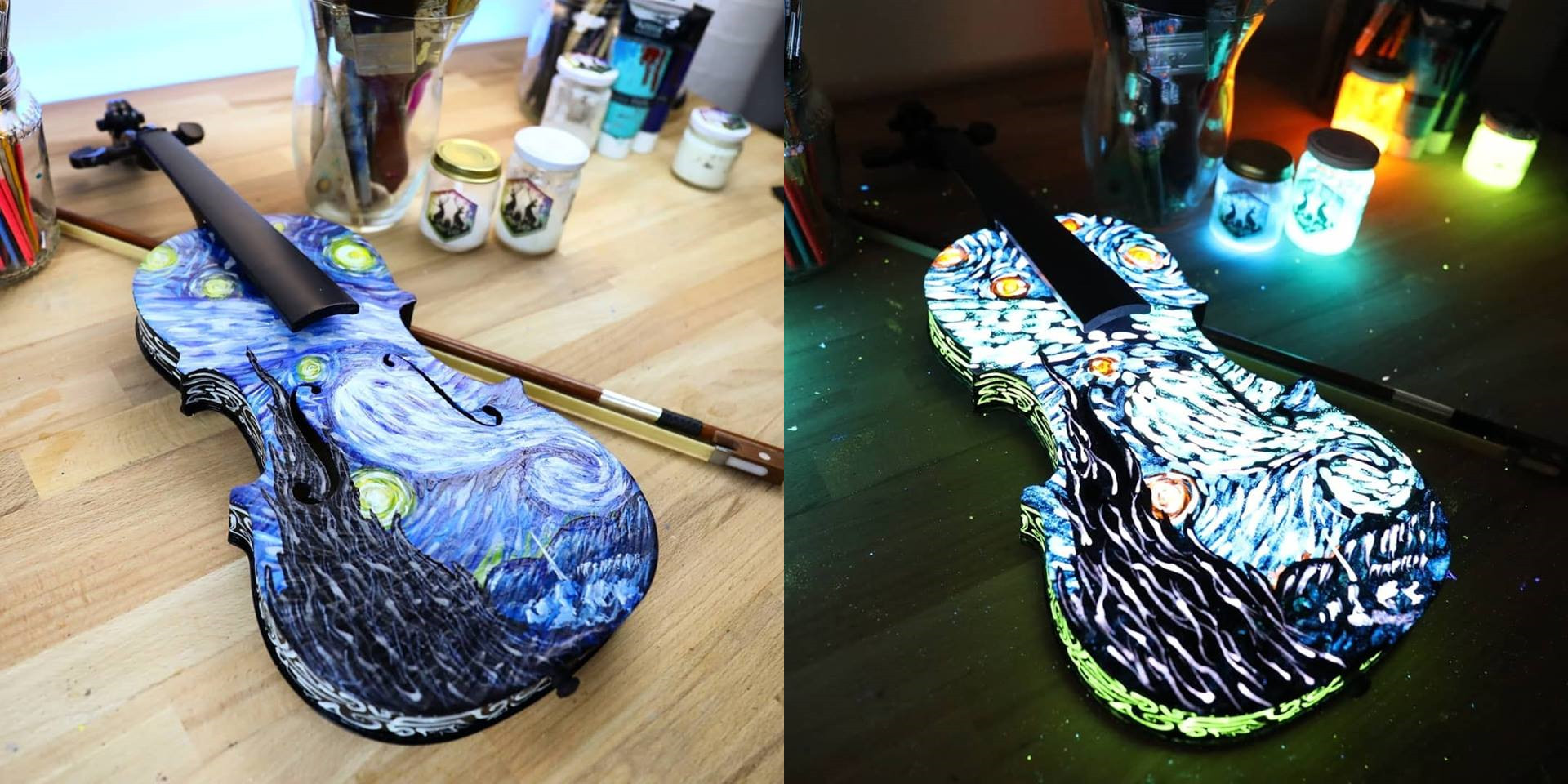 ▼梵谷的《星空》在他創造的吉他上成為了真正在黑夜璀璨的星空。