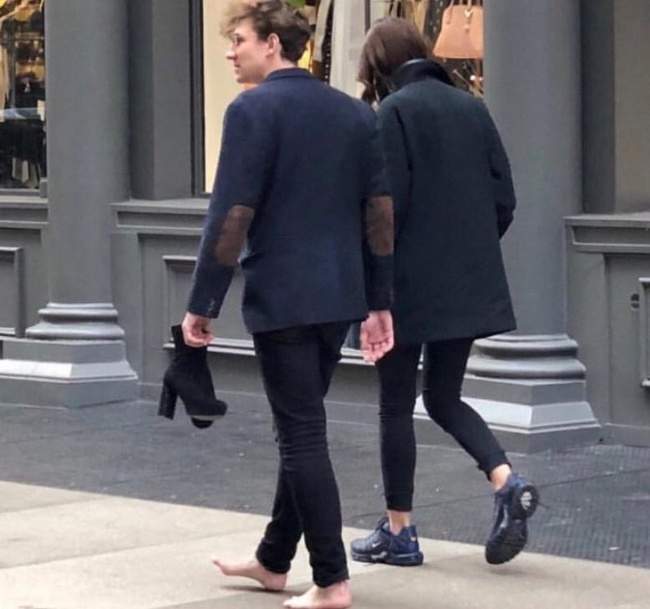 ▼女友逛街被新鞋磨破腳,男友把鞋子讓給女友,自己光腳陪逛街。