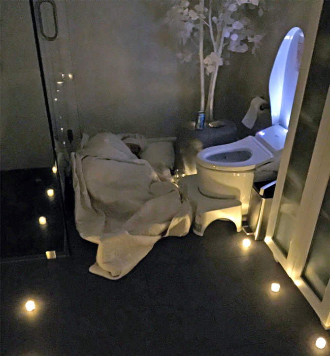 ▼女友喝多了睡倒在廁所,男友佈置溫馨的蠟燭。(?)