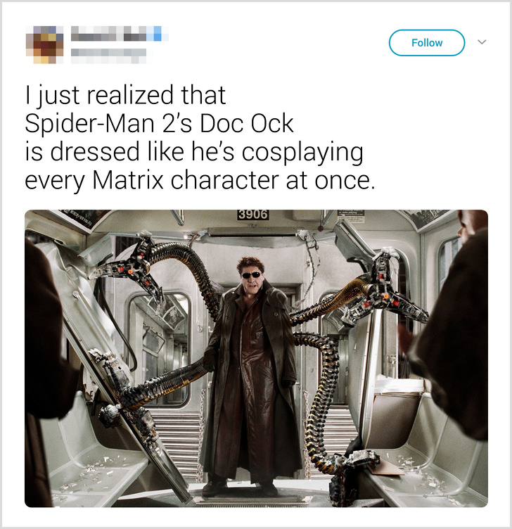 ▼重看《蜘蛛人2》中的八爪博士時,才發現他打扮得好像在將《駭客任務》中所有角色一次過 Cosplay 一樣。