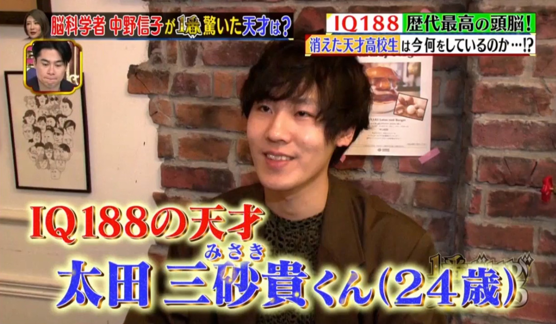 日本一名驚世天才智商比偉人霍金、愛因斯坦還要高,但是現在卻是一名無業青年?24歲的太田三砂貴是「日本史上最高智商(IQ 188)天才」,16歲就可以創作出交響曲及大師級繪畫作品,但是他最近上節目說出現況卻讓大家都傻眼了…