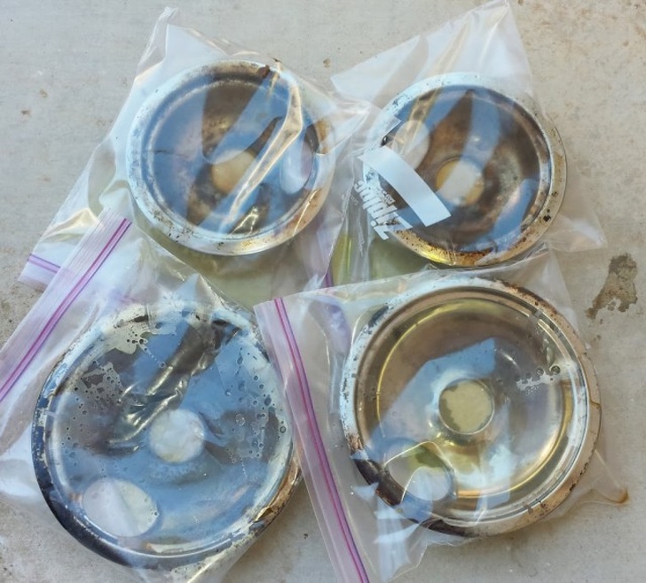 ▼10.爐灶:將氨水倒入密封塑膠袋中,把爐灶的零件放入其中密封起來;浸泡一整夜,第二天早上拿出來,用海綿擦拭乾淨。