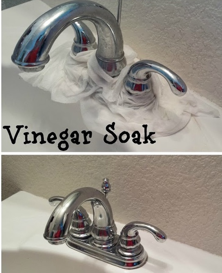 ▼1.水龍頭上的水垢:將浸滿醋的紙巾蓋在水龍頭上,30到60分鐘後拿下來,用清水沖洗一下,水龍頭上的頑固水漬就消失了。