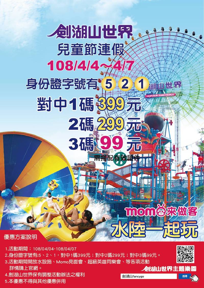 劍湖山兒童節連假票價99元! 身分證中「5、2、1」者有獎