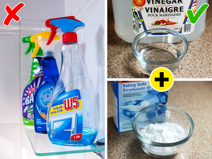 許多擁有化學成分的清潔劑都會導致過敏、在碗盤上留下奇怪的異味。使用小蘇打、醋和檸檬汁就可以取代許多清潔劑,例如一杯醋、一杯水和1/4杯的檸檬汁,混合攪勻後可以有效清理窗戶和鏡子。