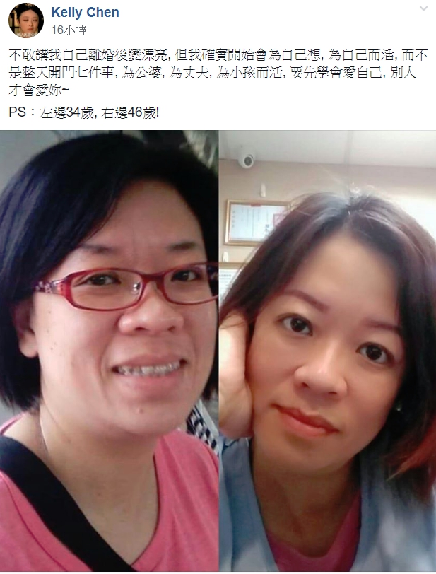 ▼Kelly Chen在臉書社團「爆廢公社」貼出自己離婚前後的對比照,46歲的她比離婚前34歲的自己更年輕漂亮。她發文表示,過去的自己為丈夫、為公婆、為小孩而活,離婚後才懂得愛自己。她想告訴廣大女性:「一定要先學會愛自己,別人才會愛你!」