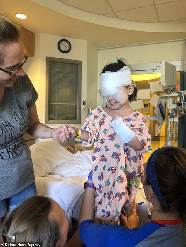 ▼手術後,Primrose很快好了起來。她慢慢學著走路,甚至能用手語與家人溝通了。媽媽說:「摘除她的眼球讓我很心痛,但這是一個正確的決定。她很快康復了,還能站起來、對著我們微笑,這是幾個月來的第一次。她在其他方面也有很大的進步,整個世界都變得美好了。」