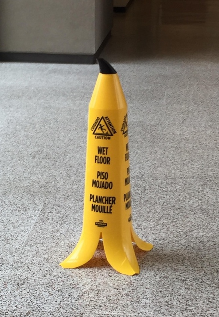 ▼香蕉皮造型的「小心地滑」告示牌。