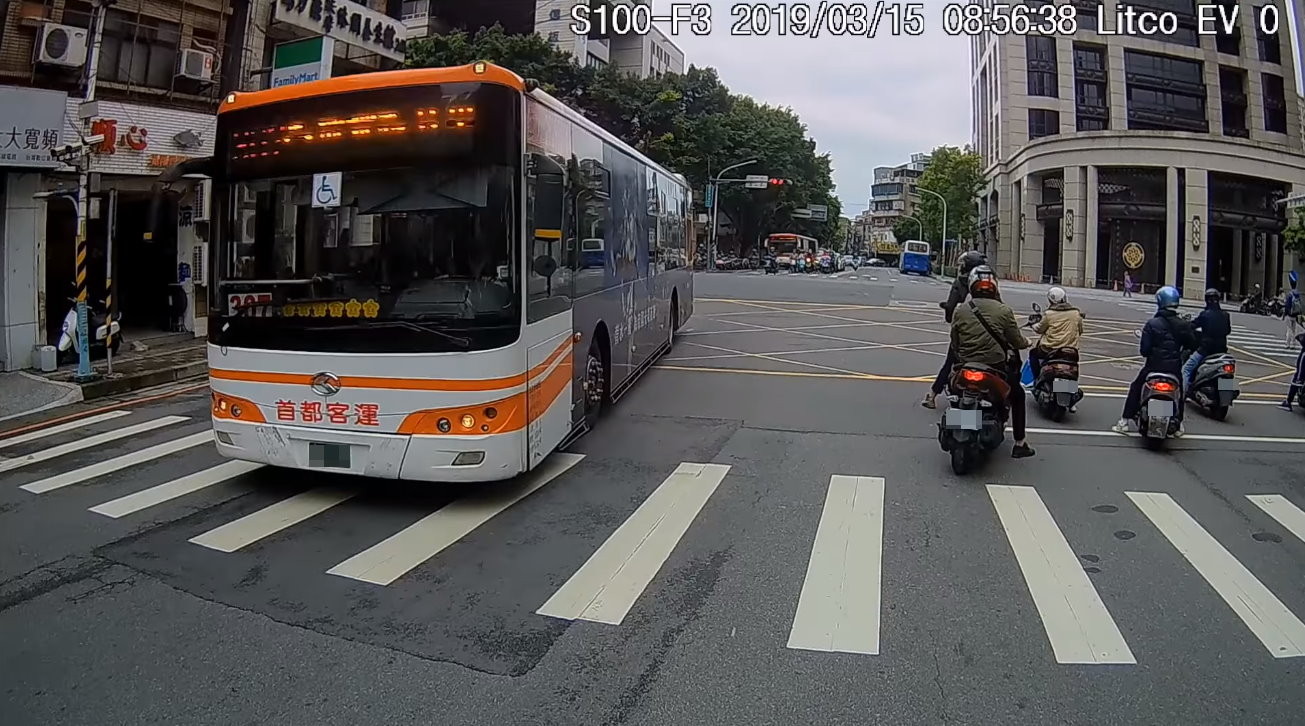 ▼從這段行車紀錄器影片,可以看到一輛首都客運「307路線公車」,它從板橋民族路右轉區運路時,會根據SOP在斑馬線前先停下來,仔細一看可以發現駕駛的右手先比左邊再比右邊。