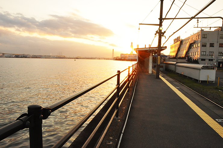 ▼月台對著大海,電車門一開就直面「京濱運河」,非常浪漫;海芝浦站還在2000年獲選「關東車站百選」之一,原因是:「近觀鶴見翼橋,遠眺橫濱的海灣大橋。這裡是最靠近上述無敵海景的車站。」