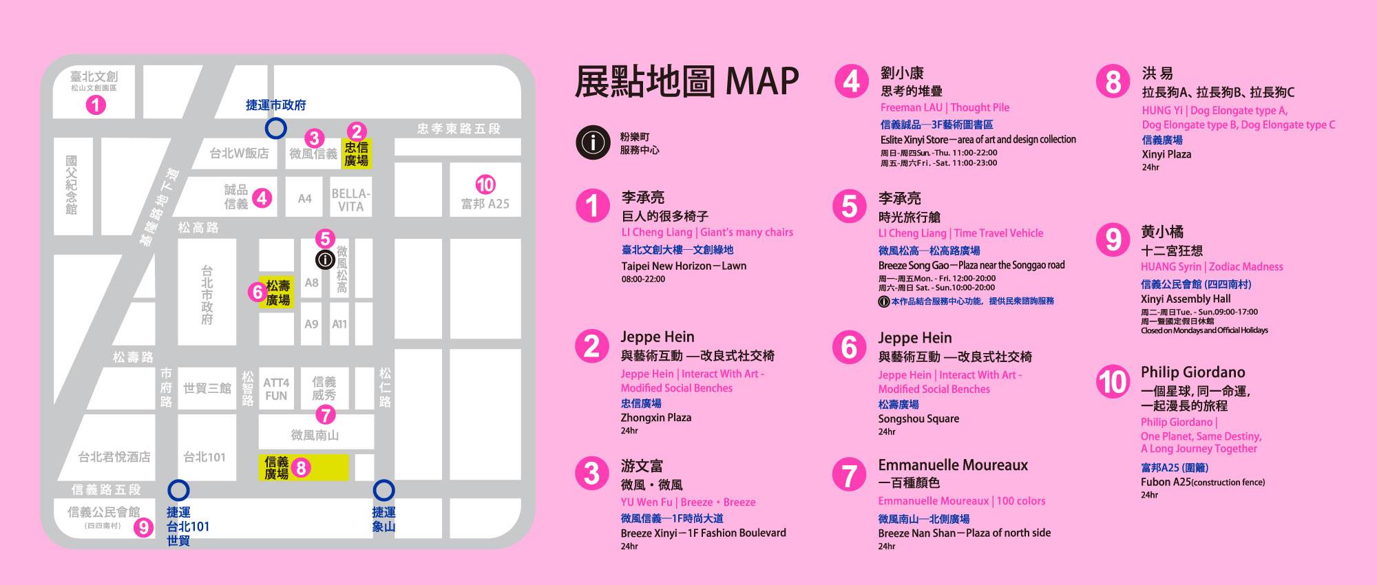 2019粉樂町當代藝術展:席、息相關Chair • Present 展覽期間:2019.3.19-2019.5.19 展覽地點:A25、忠義廣場、松壽廣場、信義廣場、信義公民會館(四四南村)、微風松高、微風信義、微風南山、誠品書店信義店、臺北文創 網站:https://www.facebook.com/fubonart/