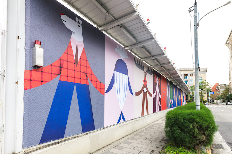 多次入圍波隆那插畫獎的Philip Giordano接棒設計富邦A25企業基地,延續去年的設計主題「全球化」,用鮮豔的色塊、大膽的線條與擬人化的動物角色,在平時混亂的施工牆上披上新衣,藝術家將這些動物角色巧妙地用「牽手」做串連,象徵地球上的生物間的共通性與相互依存的關係。