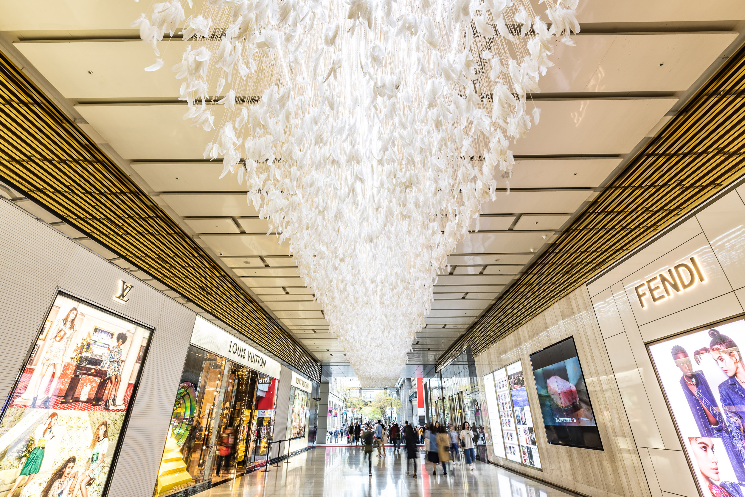 擅長用羽毛與竹籤創作的游文富,希望藉由這個作品白與翩翩的意象,交織出一片能夠隨風搖曳的天空,扭轉民眾對微風信義時尚大的想像。可以看見一根根的雪白台灣竹羽,有時芒花般綿延的白色浪潮,當微風吹拂時,觀眾可「看見」氣流的存在,竹羽間的聲響,像是感知人與環境間生生不息的關係。