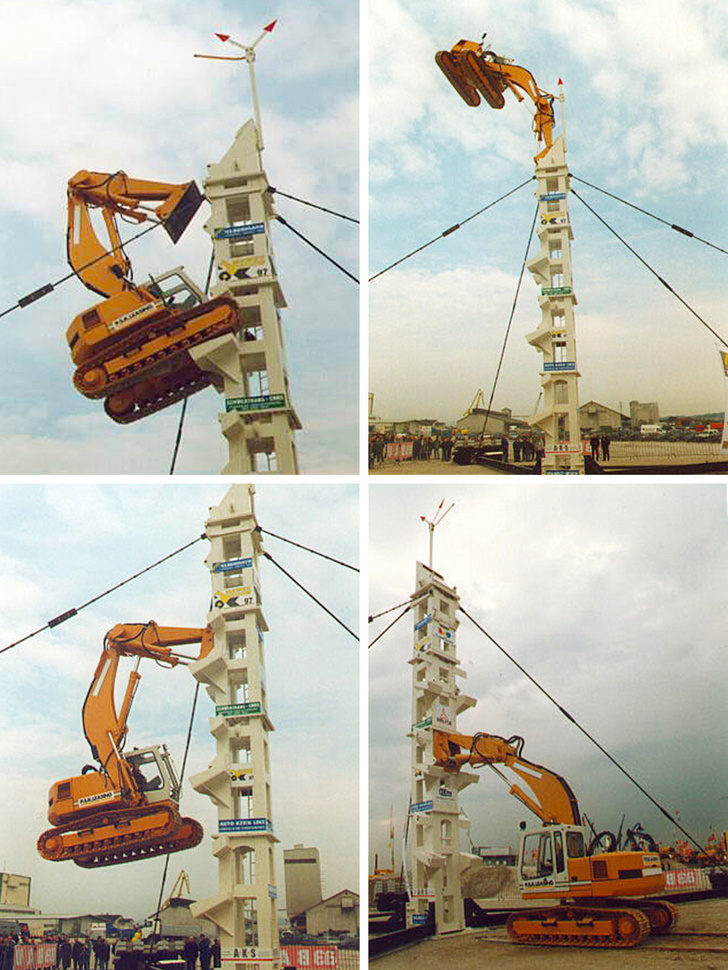 ▼8.挖土機輕輕鬆鬆爬上特製高塔,藉此展現性能。