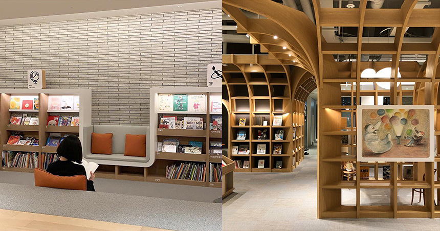 ▼第三站:「星空圖書館」搭地鐵2號縣到「三成站」5、6號出口再走一小段路就到囉!看看這三層樓高的書架,愛看書的人在這裡一天都逛不完~不論是捧著書靠牆看、還是眺望書櫃都很好拍~~