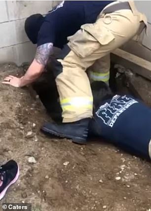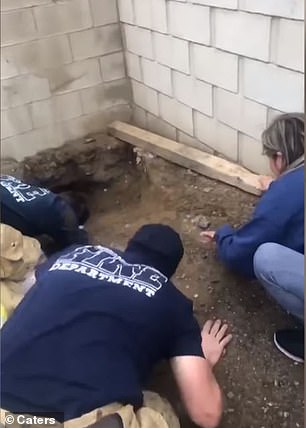 ▼男主人趴著身體鑽進洞裡,結果自己也被卡住。女主人沒有辦法,只能打電話向消防局求救。消防員們到場時,男主人已經從洞中出來,但狗狗和烏龜還待在裡面。Taylor的叫聲越來越微弱,似乎有些缺氧,情況非常危急。
